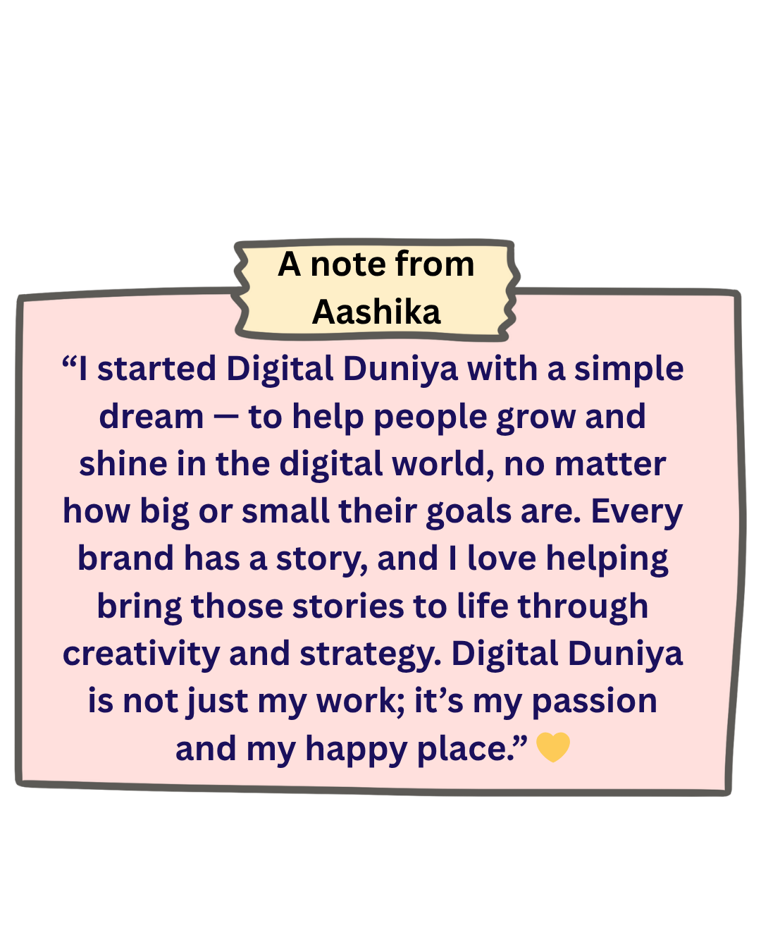 Digital Duniya is the creative vision of Aashika Jain, a passionate digital enthusiast who believes in turning ideas into impact. With a love for all things digital — from social media and branding to website design and content creation — Aashi brings a fresh, personal touch to every project.